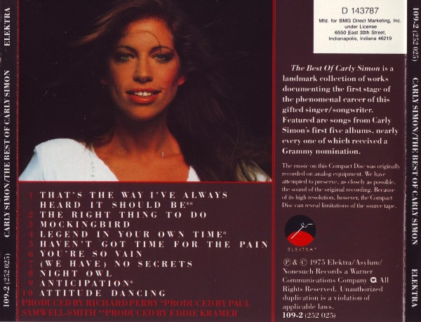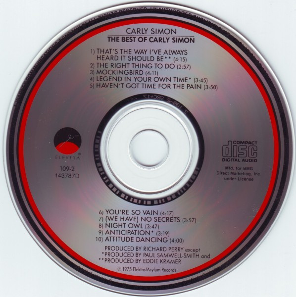 Carly Simon – The Best Of Carly Simon (CD) 1975 Elektra 109-2 (252 025) usa 7/7