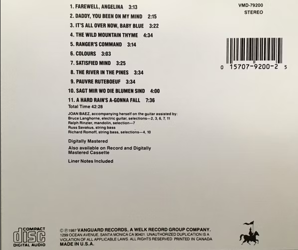 Joan Baez – Farewell, Angelina (cd) 1987 vmd-79200 usa 8/8